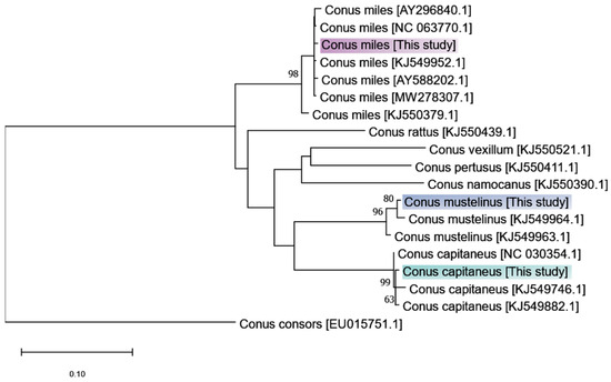A maximum likelihood method was used to reconstruct a phylogenetic tree using COI fragments mined and assembled from the raw reads of C. capitaneus, C. miles, and C. mustelinus together with CO1 sequences of other vermivorous cone snails obtained from NCBI (Figure 1). The phylogenetic tree shows that the CO1 sequences recovered from the transcriptome data unambiguously grouped with sequences from the target species, confirming the taxonomic identity of the specimens.