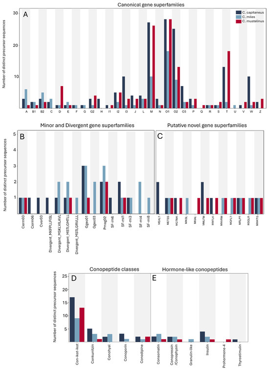 Frequency of conopeptide superfamilies identified in the venom gland transcriptomes of C. capitaneus, C. miles, and C. mustelinus. (A) Canonical conotoxins; (B) minor gene superfamilies; (C) putative novel gene superfamilies; (D) conopeptide classes; (E) hormone-like conopeptides.