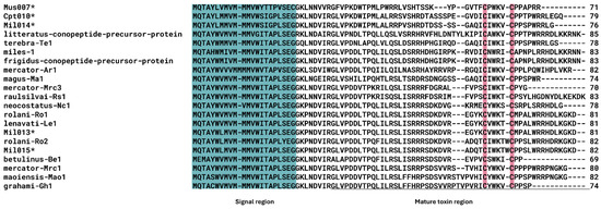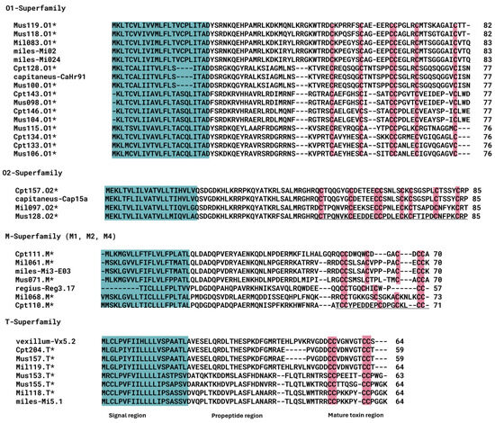 Representative members of the O1-, O2-, M-, and T-superfamilies. The signal peptide sequence is highlighted in blue, the toxin region is underlined, and cysteine residues are emphasized in red. Asterisk (*) represents sequences identified in this study.