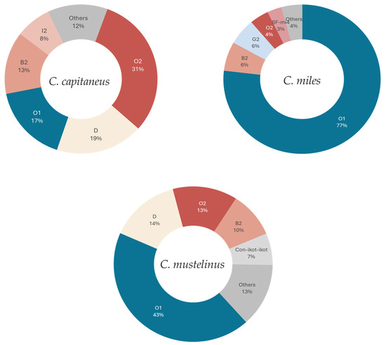 Comparison of relative gene expression levels of the most highly expressed conopeptide gene superfamilies in C. capitaneus, C. miles, and C. mustelinus. The conopeptide gene superfamilies classified as “Others” are detailed in Supplementary File S4.