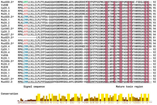 Multiple sequence alignment of D-superfamily conotoxins. The signal and mature peptide regions are underlined, and cysteine residues are highlighted in pink. Asterisk (*) represents the sequences identified in this study. Colored amino acids indicate a signal peptide motif.