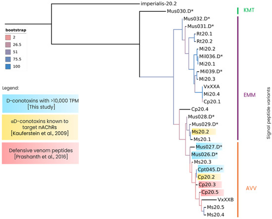 Conopeptides that act as antagonists to neuronal nAChRs are classified as α-conotoxins, most of which belong to the A-, M-, S-, C-, and D-superfamilies [28]. Figure 5 shows several αD-conotoxin-like sequences with high sequence similarity to previously reported conotoxins, along with three identified signal peptide motifs: EMM, AVV, and a putative novel motif, KMT (Figure 6). Notably, the highly expressed Cpt045.D (TPM 35273.39) and Mil036.D (TPM 2053.48) exhibit 100% sequence identity with previously characterized C. capitaneus conotoxin Cp20.2 and C. miles conotoxin Mi20.1 [29], respectively (Figure 5; Figure 6). For C. mustelinus, conotoxins Mus028.D and Mus029.D share over 95% identity with the previously identified Ms20.2 [28], while Mus026.D (TPM 53931.68) and Mus027.D (TPM 14774.67) share 89.2% and 83.9% identity, respectively [29].