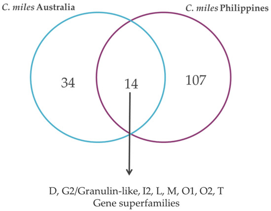 Venn diagram representation of conotoxin precursor sequences (identified via transcriptomics) that were shared between or unique to the two C. miles individuals from Australia and the Philippines. For the shared sequences, the different gene superfamilies are shown.