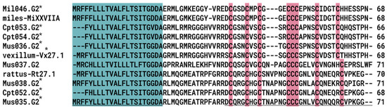 In this study, we also report thirty-seven precursors identified in C. miles with sequence similarity to the validated sequences in the previously reported C. miles venom gland transcriptome of a specimen from the Great Barrier Reef, Australia [19]. Of these, fourteen are identical (Figure 7), nine sequences have 82–99%, and fourteen sequences have <70% sequence similarity (Supplementary File S3).