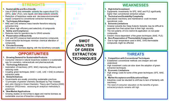 Green extraction techniques are emerging as sustainable methods in the recovery of bioactive compounds, prioritizing sustainability (use of renewable biomass, alternative solvents, production of co-product), safety (final extract without contaminants), and efficiency, aligning with the six principles of green extraction of natural products. Figure 1 aims to highlight the positioning of green extraction techniques. The SWOT (strengths, weaknesses, opportunities, and threats) assessment highlights the potential of green extraction techniques as eco-friendly and sustainable alternatives to conventional methods. Their strengths in sustainability, bioactivity improvement, and global initiatives are offset by economic and scalability challenges. However, technological innovations and rising demand for sustainable products by consumers are driving their adoption. Addressing the weaknesses in scalability and market applications could accelerate their integration at industrial scale by reducing operation costs through the optimization of the green extraction processes and training more professionals.