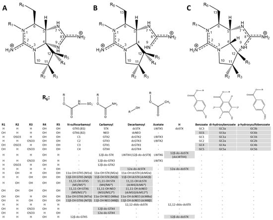 Structures of known PSPTs. The majority of PSPTs are associated with structure (A). Compounds in grey have been elucidated, but their structures are not fully validated by more exhaustive methods (NMR, synthesis, etc.). Compounds labeled with (*) represent M-toxin congeners where the C-N bond is broken between positions 4 and 9, structure (B), but have functional groups at positions on the standard saxitoxin tricyclic ring system. Two additional skeletal structures also exist associated with structure (C), which is the hemiacetal for the PSPTs M5-HA and M6-HA, and R groups corresponding with M5 and M6. Literature sources for each congener are in Table 1.