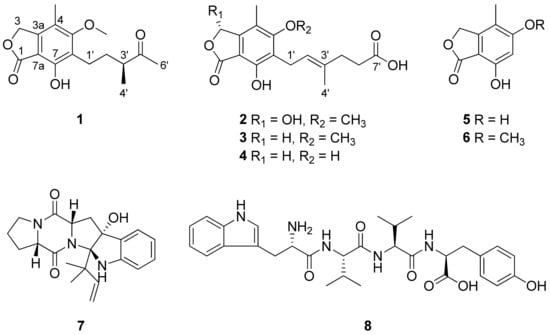 The known compounds isolated from P. brevicompactum were identified as mycophenolic acid (3) [], O-desmethyl mycophenolic acid (4) [], 5,7-dihydroxy-4-methylphthalide (5) [], 7-hydroxy-5-methoxy-4-methyl-1(3H)-isobenzofuranone (6) [], brevianamide E (7) [], and L-tryptophyl-L-valyl-L-valyl-L-tyrosine (8) [] upon comparison with spectroscopic data from previously reported studies (Figures S12–S17). To our knowledge, compound 8 was isolated and structurally identified from P. brevicompactum for the first time.