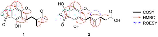 Key 1H-1H COSY, HMBC, and ROESY correlations of 1 and 2.