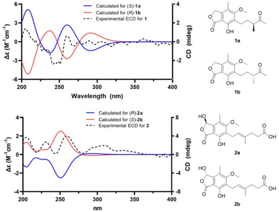 The HMBC correlations (Figure 2) of 1, from H2-3 to C-1 (δC 173.5), C-3a (δC 146.7), C-4 (δC 117.7), and C-7a (δC 107.6), led to the assignment of the presence of a five-membered lactone ring attached via C-3a and C-7a. Additionally, the existence of skeleton 6 was deduced in its chemical structure based on the HMBC correlations between 4-CH3/C-3a, 4-CH3/C-4, 4-CH3/C-5 (δC 164.7), H2-1′/C-5, H2-1′/C-6 (δC 123.7), H2-1′/C-7 (δC 154.6), and 5-OCH3/C-5. An additional six carbons were indicative of 3-methylpentan-2-one, indicated by the analysis of 1H-1H COSY correlations from H2-1′ to H3-4′ and key HMBC correlations between H3-4′/C-5′, H3-6′/C-3′, and H3-6′/C-4′ (Figure S3). The position of the 3-methylpentan-2-one was established by HMBC correlations from H2-1′ and H2-2′ to C-6. After assigning the planar structure of 1, its experimental electro circular dichroism (ECD) spectrum (Figure 3 and Table S1) was compared with the computed ECD data of two possible isomers (1a and 1b). The S-oriented configuration of the methyl group attached at C-3′ of 1 was same as that of euparvic acid, previously identified from Eupenicillium parvum []. The assigned stereochemistry at C-3′ was further confirmed by a comparison of the experimental (–21.6) and the calculated (–23.1) optical rotation values for 1. Therefore, the chemical structure of 1, with its absolute configuration, was determined as shown in Figure 1. According to the previous work, compound 1 was obtained from the fermentation of dihydromycophenolic acid by Helminthosporium bicolor and Aspergillus sp. [], but its absolute configuration was determined for the first time in our study. In fact, the absolute chemical structure of 1 was elucidated as depicted in Figure 1 and was trivially named brevicolactone A.