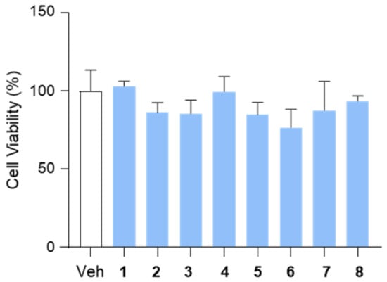 To assess the effects of the isolated compounds (1–8) on cell viability, we performed a CCK-8 assay in HepG2 cells. The cells were treated with each compound at a concentration of 10 μM for 12 h, and cell viability was subsequently measured. The results indicated that none of the tested compounds exhibited cytotoxic effects under these conditions, suggesting their suitability for further biological evaluation (Figure 4).