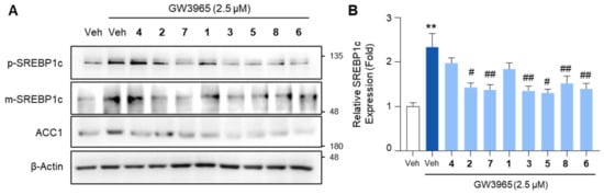 The inhibitory effects of the isolated compounds on the expression of SREBP1c and ACC1. HepG2 cells were treated with GW3965 (2.5 μM) for 12 h, followed by a 30 min pretreatment with the compounds (10 μM). DMSO (0.1%) served as the vehicle control. (A) Total cell lysates were subjected to the immunoblot analysis of SREBP1c and ACC1. β-Actin was used as a loading control. (B) Relative SREBP1c expression normalized to the expression of β-Actin. Values represent means ± SEM. The statistical evaluation was performed by a one-way ANOVA with a Tukey’s post hoc test for multiple comparisons (** p < 0.01 versus vehicle control; # p < 0.05 and ## p < 0.01 versus GW3965-treated condition). Veh, vehicle; p-SREBP1c, the premature form of SERBP1c; m-SREBP1c, the mature form of SREBP1c.