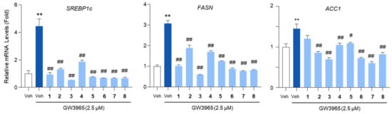 The inhibition of the lipogenic gene expression by the isolated compounds. HepG2 cells were treated with GW3965 (2.5 μM) for 12 h, followed by a 30 min pretreatment with the compounds (10 μM). DMSO (0.1%) served as the vehicle control. The RNA extracted from the cells was subjected to an RT-qPCR analysis of SREBP1c, FASN, and ACC1. 36B4 was used as a reference gene. Values represent means ± SEM. The statistical evaluation was performed by a one-way ANOVA with a Tukey’s post hoc test for multiple comparisons (** p < 0.01 versus vehicle control; # p < 0.05 and ## p < 0.01 versus GW3965-treated condition).
