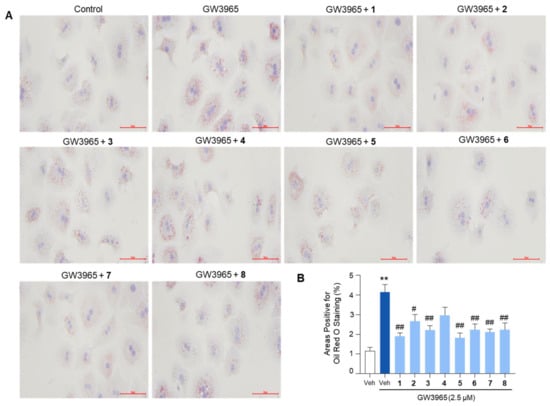 The inhibition of lipid accumulation in hepatocytes by the isolated compounds. Primary mouse hepatocytes were treated with GW3965 (2.5 μM) for 24 h, followed by a 30-min pretreatment with the compounds (10 μM). DMSO (0.1%) served as the vehicle control. (A) The cells were subjected to Oil Red O staining for the visualization of intracellular lipid accumulation. Scale bars indicate 70 μm. (B) The areas positive for Oil Red O staining were quantified. Values represent means ± SEM. The statistical evaluation was performed by a one-way ANOVA with a Tukey’s post hoc test for multiple comparisons (** p < 0.01 versus vehicle control; # p < 0.05 and ## p < 0.01 versus GW3965-treated condition).