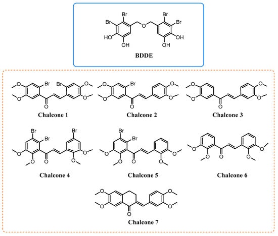 Chemical structure of the marine natural bromophenol BDDE, and the seven structure-related brominated and non-brominated chalcones (1–7).