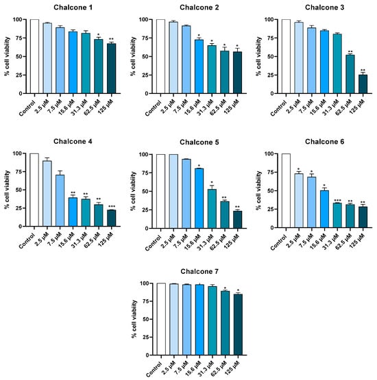 Cytotoxicity of chalcones 1–7 using a resazurin reduction assay in HaCaT cells by comparison with the control. Bar graphs represent the mean ± SEM of at least three independent experiments performed in triplicate. Statistical analysis: one ANOVA with Dunnett’s multiple comparisons test, where p < 0.05 was considered significant when compared to the control condition. * p < 0.05, ** p < 0.01, and *** p < 0.0005.