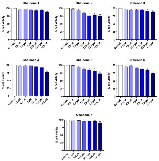 Cytotoxicity of chalcones 1–7 using the resazurin reduction assay in macrophages by comparison with the control. Bar graphs represent the mean ± SEM of at least three independent experiments performed in triplicate. Statistical analysis: one ANOVA with Dunnett’s multiple comparisons test, where p < 0.05 was considered significant when compared to the control condition. * p < 0.05, and ** p < 0.01.