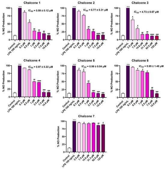 NO production by macrophages treated with LPS (100 ng/mL) or not (control) in the presence of chalcones 1–7. Results are expressed as a percentage of NO production by cells treated with LPS (100 ng/mL). Each value represents the mean ± SEM of four independent experiments in duplicate. Statistical analysis: one ANOVA with Dunnett’s multiple comparisons test, where p< 0.05 was considered significant. *** p < 0.005, relative to the control, and # p < 0.05, ## p < 0.01, ### p < 0.0005, and #### p < 0.0001, relative to LPS condition.