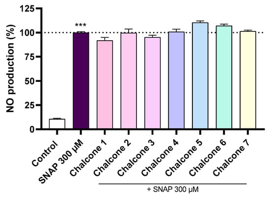 Scavenger activity of chalcones 1–7 at 7.5 μM in the presence of SNAP solution (300 µM). Bar graphs represent the mean ± SEM of at least three independent experiments performed in triplicate. Statistical analysis: one ANOVA with Dunnett’s multiple comparisons test, where p < 0.05 was considered significant when compared to the control condition. *** p < 0.0005.