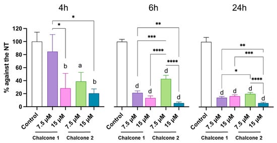 To investigate the underlying mechanism of action of the most promising brominated chalcones (1 and 2), their effects on iNOS protein levels were assessed in LPS-stimulated macrophages at different time points (4, 6, and 24 h). The non-treated (NT) condition, consisting of macrophages stimulated with LPS but receiving no chalcone treatment, was used as the reference for maximal iNOS induction under inflammatory conditions and served as a positive control. The selected concentrations (7.5 μM and 15 μM) were selected based on chalcones 1 and 2 cytocompatibility (Figure 3) and efficacy in reducing NO production (Figure 4). Since NO production is a direct consequence of iNOS enzymatic activity, where the enzyme catalyzes the conversion of L-arginine to NO following inflammatory stimulation such as LPS, this provides a functional readout of iNOS expression and activity [33,38].