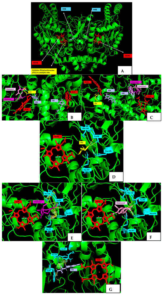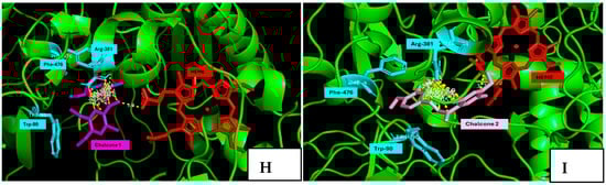 (A) Dimerized iNOS enzyme with two heme groups, two co-factors (H4B and H2B), and the well-known inhibitor ITU; (B) chalcones 1 and 2 and ITU represented in the catalytic site of the iNOS enzyme; (C) chalcones 1 and 2 and co-factor H4B in the local active site of the co-factor required for the dimerization and activation of the enzyme; (D–F) interaction between residues of the catalytic site with ITU inhibitor (D), chalcone 1 (E), and chalcone 2 (F); and (G–I) interaction between residues of the local active site of the co-factor H4B with the co-factor H4B (G), with chalcone 1 (H), and with chalcone 2 (F). Heme group: prosthetic group; H4B and H2B co-factors: 5,6,7,8-tetrahydrobiopterin and 2-amino-6-(1,2-dihydroxypropyl)-7,8-dihydro-6H-pteridin-4-one co-factors, and ITU: S-ethylisothiourea inhibitor. Phe: phenylalanine, Trp; tryptophan; Arg: Arginine; and Met: methionine.
