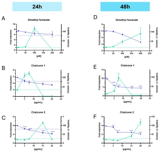 Nrf2 activation using the KeratinoSens™ assay in HaCaT cells transfected with an Nrf2 luciferase reporter construct, incubated for 24 h (A–C) or 48 h (D–F) with chalcones 1 and 2. DMF was used as a positive control. Data represent the results from four independent experiments. Non-linear regression analysis was performed using GraphPad Prism v.9.0.0 for Windows. The blue line represents the results of cell viability (% regarding the control) and the green line represents fold induction. Statistical analysis: one ANOVA with Dunnett’s multiple comparisons test, where significance includes. * p < 0.05, ** p < 0.01, *** p < 0.0005, and **** p < 0.0001.