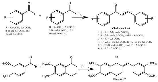 Synthesis of chalcones (1–7). (i) NaOH, MeOH, r.t., 2 h–1 week. Adapted from Jesus et al. [25].