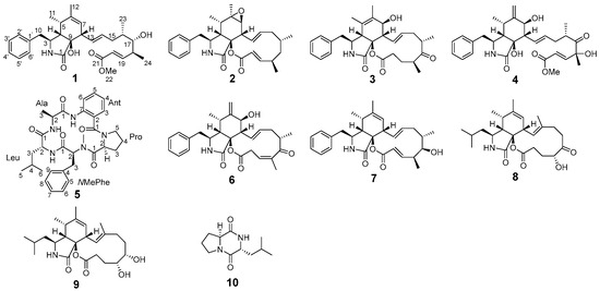 - Zhou, G.-X.; Wijeratne, E.M.K.; Bigelow, D.; Pierson, L.S.; VanEtten, H.D.; Gunatilaka, A.A.L. Aspochalasins I, J, and K: Three New Cytotoxic Cytochalasans of Aspergillus flavipes from the Rhizosphere of Ericameria laricifolia of the Sonoran Desert. J. Nat. Prod. 2004, 67, 328–332. [Google Scholar] [CrossRef]