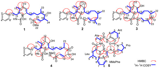 The Key 1H–1H COSY, HMBC correlations of compounds 1–5.