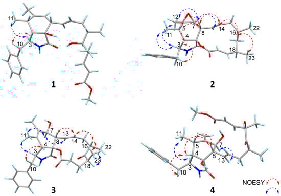 Colachalasin J (1) was obtained as colorless crystals. The molecular formula was determined to be C29H39NO5 based on the [M + H]+ ion peak at m/z 482.2892 [M + H]+ (calcd for 482.2901) in HRESIMS, requiring eleven degrees of unsaturation. The 1H NMR data (Table S2) indicated the presence of four methyl groups, a methoxy group, three double bonds, and a monosubstituted phenyl group. The 13C NMR data (Table S2) and the HSQC spectrum revealed 29 carbon signals, which were categorized into five methyl groups, two methylene groups, seventeen methine carbons (ten olefinic), and five non-hydrogenated carbons (two of which were carbonyls). These NMR data indicated that compound 1 is a cytochalasin [8].