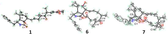 Furthermore, the known compounds 6 and 7 were crystallized from a mixed solvent of ethanol and H2O, and their single-crystal X-ray diffraction analysis is shown in Figure 5.