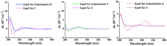 ECD spectra of 2 and colachalasin D, 3 and colachalasin F, 4 and colachalasin A.