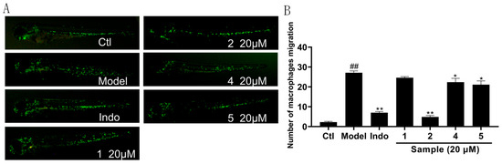 Considering the remaining amount of these compounds, compounds 1, 2, 4, 5 were selected for evaluation of anti-inflammatory activity in CuSO4-induced transgenic fluorescent zebrafish. The extent of inflammation was assessed by monitoring the migration of macrophages along the lateral line. As shown in Figure 7A, compounds 2, 4, and 5 reduced inflammatory, as evidenced by a higher accumulation of macrophages at the lateral line compared to controls. Furthermore, as shown in Figure 7B, compound 2 at 20 μm demonstrated superior anti-inflammatory activity compared to the positive control indomethacin at 20 μm.