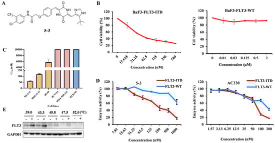The proliferation of FLT3-ITD mutant cells was selectively inhibited by 5-3. (A) The chemical structure of 5-3. (B) BaF3 transfectants stably expressing wild-type FLT3 or mutated FLT3s were treated with compound 5-3 for 48 h. After treatment, cell viability was assessed by MTT assay. (C) The IC50 of 5-3 on multiple cancer cells. (D) The inhibition curve of 5-3 on FLT3-ITD and FLT3-WT enzyme. (E) CETSA assays verified the interaction of 5-3 with FLT3 protein in MV4-11 cells.
