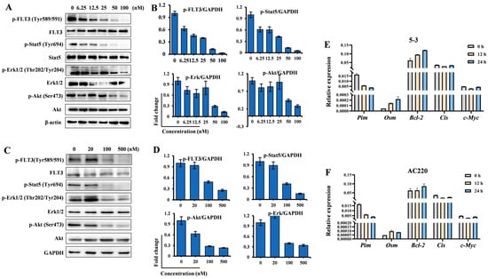 The impact of compound 5-3 on the FLT3 pathway in FLT3-ITD mutant cells. (A,B) The FLT3-ITD overexpressing BaF3 cells were treated with a range of concentrations (6.25, 12.5, 25, 50, and 100 nM) of compound 5-3 for 4 h. Subsequently, the whole-cell lysates were prepared and subjected to Western blot analysis to detect the phosphorylation levels of FLT3 and its downstream signaling molecules. (C,D) The FLT3-ITD mutant MV4-11 cells were treated with a series of concentrations (20, 100 and 500 nM) of compound 5-3 for 4 h. Subsequently, the proteins were extracted for Western blot analysis. (E,F) The FLT3-ITD mutant MV4-11 cells were treated with compound 5-3 (1000 nM) or AC220 (100 nM) for 12 and 24 h, respectively, and then the cDNA were extracted for RT-PCR analysis.