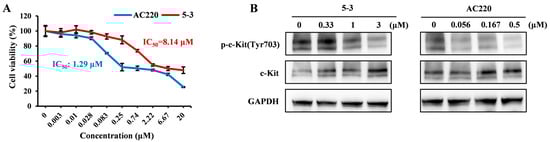 Effects of 5-3 on the phosphorylation of c-KIT. (A) The c-KIT overexpressing Kasumi-1 cells were treated with different concentrations of compound 5-3 and AC220 for 48 h, respectively. After treatment, cell viability was assessed by the MTT assay. (B) Kasumi-1 cells were treated with 5-3 and AC220 at different concentrations for 4 h, and then whole-cell lysates were subjected to Western blot analysis to detect the phosphorylation of c-KIT.