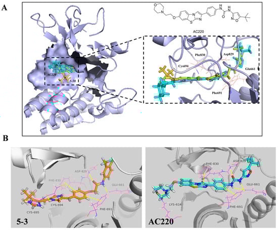 Binding mode of compound 5-3 within the crystal structure of FLT3 (PDB: 4XUF). (A) Compound 5-3 (orange sticks) and AC220 (blue sticks) are depicted along with the surface representation of the binding site. (B) The detailed view of the interactions is presented; side chains of residues involved in hydrophobic or π-interactions are depicted as gray sticks. Amino acid residues forming hydrogen bonds are illustrated with both main and side chains represented as cyan sticks. Other atoms are colored as follows: nitrogens (blue), oxygens (red), sulfur (yellow) and polar hydrogens (white).