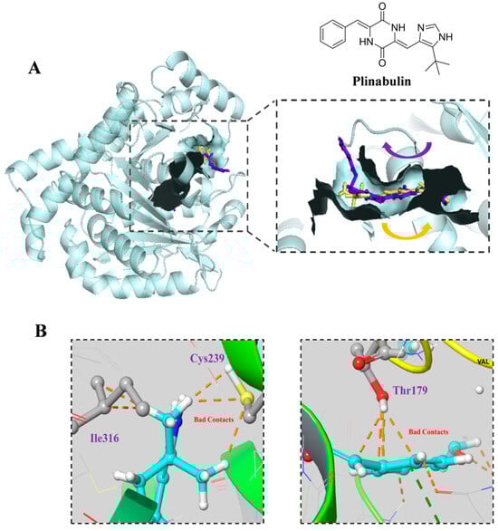 Interaction of compound 5-3 and Plinabulin with β-tubulin. (A,B) Binding modes of compound 5-3 and Plinabulin with β-tubulin (PDB: 5XHC), where the orange dotted lines represent unfavorable contacts.
