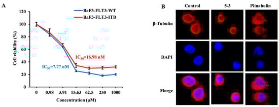 The activity of Plinabulin and 5-3 on β-tubulin. (A) The toxicity of Plinabulin on FLT3-ITD and FLT3-WT overexpressing BaF3 cells. (B) Immunofluorescence analysis of compound 5-3 and Plinabulin binding to β-tubulin. MV4-11 cells were treated with Plinabulin (5 nM) or compound 5-3 (200 nM) for 24 h, followed by staining with β-tubulin antibody and DAPI. Confocal microscopy was used to capture images, where red represents tubulin and blue represents DAPI.