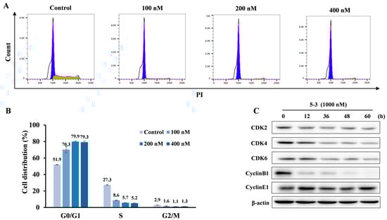 To gain a further insight into the mechanism of cancer cell suppression activity, we examined cell cycle arrest of compound 5-3 against MV4-11 cells by flow cytometry. As shown in Figure 7A,B, 5-3 increased G1 population in a dose-dependent manner; for example, 5-3 resulted in 1.35, 1.53 and 1.53-fold increases in the percentage of G1 phase than the untreated group at the concentrations of 100, 200 and 400 nM, respectively. Western blotting assay indicated that 5-3 significantly induced the decrease in cell cycle-related proteins at 1000 nM, including CDK2, CDK4, CDK6, Cyclin B1 while no obvious change in Cyclin E1 and p21 (Figure 7C) was observed.
