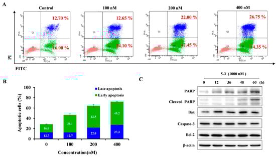 Effects of compound 5-3 on apoptosis. (A) The original diagram illustrating the apoptotic cells from flow cytometry. The red, blue, and green colors represent the populations of viable cells, early apoptotic cells, and late apoptotic cells, respectively (B) FLT3-ITD mutant MV4-11 cells were treated with compound 5-3 (at concentrations of 100, 200, and 400 nM) for 48 h, followed by flow cytometry analysis. (C) FLT3-ITD mutant MV4-11 cells were exposed to 1000 nM of compound 5-3 for 12, 36, 48 and 60 h, respectively, and subsequently subjected to SDS-PAGE for Western blot analysis.