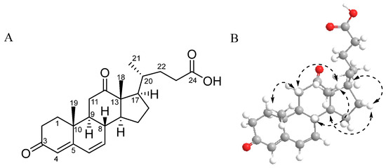 DOCDA (Figure 1A) was isolated as a dark yellow oil, and LR-ESI-MS spectroscopic analysis revealed an ion peak at m/z 385.23 [M + H]+. The 1H NMR spectrum of DOCDA displayed three olefinic protons at δH 6.22 (dd, J = 9.9, 2.5 Hz, H-6), 6.19 (dd, J = 9.9, 2.5 Hz, H-7), and 5.66 (s, H-4), two singlet methyl protons at δH 1.15 (s, H-19) and 1.08 (s, H-18), and one doublet methyl proton at δH 0.78 (d, J = 6.4 Hz, H-21). The 13C and HSQC NMR spectra indicated the presence of twenty-four carbons, including three carbonyl carbons at δC 174.7 (C-24), δC 197.9 (C-3), and δC 212.2 (C-12), four olefin carbon resonances at δC 123.5 (C-4), δC 128.1 (C-6), δC 139.5 (C-7), and δC 162.1 (C-5), three methyl carbons at δC 11.1 (C-18), δC 15.6 (C-19), and δC 18.7 (C-21), and two quaternary carbons at δC 57.2 and δC 36.3. A pregna-4,6-diene-3,12-dione moiety was identified from the 1H-1H COSY correlations [H-1/H-2/H-3/H-4, H-6/H-7/H-8, H-8/H-10/H-11, H-14/H-15/H-16/H-17] and HMBC correlations [H-4/C-3/C-6/C-10; H-6/C-5/C-7; H-7/C-9/C-14; H-15/C-8/C-14; H-16/C-13/C-20; H-18/C-12/C-13/C-14/C-20; H-19/C-1/C-5/C-9/C-10] [39]. The side chain of DOCDA was elucidated through additional 1H-1H COSY correlations and HMBC correlations. COSY correlations were observed between H-20/H-21, H-20/H-22, and H-22/H-23. In addition, key HMBC correlations included those from the doublet methyl proton H-21 to C-17 and C-22, and from the methylene proton H-23 to C-20, C-22, and the carbonyl carbon C-24 at δC 174.7. Based on a comparison with previously reported MS data, the compound was identified as DOCDA [40]. The relative stereochemistry of DOCDA was assigned on the basis of a 2D NOESY experiment (Figure 1B). The observation of NOE correlations [H3-18/H-11β/H-8, H3-19/H-11β] indicated that both H-8 and H-19 were in β-orientation. Additionally, NOE correlations [H-17/H-16α/H-14] established the α-orientations of H-14 and H-17. Since almost all 20-methylsterols isolated from natural products exhibit a 20S configuration according to the literature [41,42,43], DOCDA was, thus, assigned the same configuration. DOCDA was initially described as a minor unsaturated metabolite produced during the anaerobic degradation of cholic acid by Pseudomonas sp., and was later isolated from the plant Allardia tridactylites [40,44]. However, the full NMR spectroscopic data for this compound have not yet been reported (Figures S1–S6). To the best of our knowledge, no steroids have been previously isolated from Rhodococcus sp. strains. Reported studies have only described the biotransformation of externally supplied steroidal substrates by Rhodococcus species [34,45].