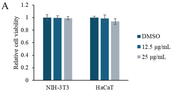 The crude extract or compound was initially dissolved in dimethyl sulfoxide (DMSO; Sigma-Aldrich). NIH-3T3 and HaCaT cells were seeded in 96-well plates at a density of 3 × 103 cells per well and allowed to adhere overnight. Following this incubation, the cells were treated with designated concentrations of the crude extract or compound for 48 h. After treatment, MTT reagent was added to each well, and the plates were incubated for 4 h under standard conditions (37 °C, 5% CO2). To solubilize the resulting formazan crystals, 150 μL of DMSO was added per well. Absorbance was then measured at 570 nm using a microplate reader (BioTek Instruments).