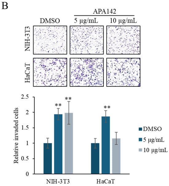 Effect of the Rhodococcus sp. crude extract on the cell viability and cell motility. (A) MTT assay results showing the viability of NIH-3T3 and HaCaT cells after treatment with Rhodococcus sp. crude extract at concentrations of 12.5 and 25 μg/mL for 48 h. Data are presented as mean ± SD (n = 6). (B) Representative images from the Transwell invasion assay of NIH-3T3 and HaCaT cells treated with 5 and 10 μg/mL of the crude extract. Quantification of invaded cells is shown in the accompanying graph. Data are presented as mean ± SD (n = 5). ** p < 0.01 vs. vehicle control (1% DMSO).