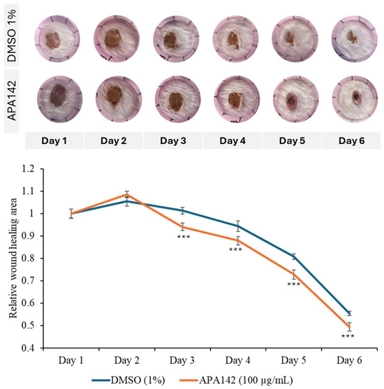 In vivo wound healing assay demonstrating the pro-regenerative effect of Rhodococcus sp. crude extract. Representative images of mouse wounds treated topically with either 1% DMSO (control) or Rhodococcus sp. crude extract (APA–142, 100 μg/mL) from day 1 to day 6 post-wounding. Quantitative analysis of wound closure rates over the 6-day period is shown, with values normalized to the initial wound area on day 1. Data are presented as mean ± SD (n = 6 per group). *** p < 0.001 vs. vehicle control (DMSO).