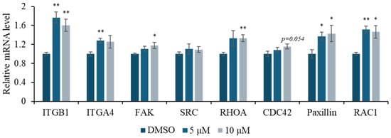 DOCDA treatment enhances expression of focal adhesion and cytoskeletal regulators. Relative mRNA expression levels of key adhesion molecules and signaling mediators, including ITGB1, ITGA4, FAK, SRC, RHOA, CDC42, paxillin, and RAC1, were analyzed by qRT-PCR in HaCaT cells treated with DOCDA at 5 μM and 10 μM for 48 h. Gene expression levels were normalized to ACTIN and are presented as fold changes relative to the vehicle control (DMSO). Data are shown as mean ± SEM (n = 3); * p < 0.05; ** p < 0.01 vs. vehicle (DMSO).