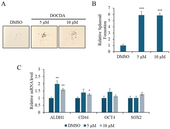 DOCDA treatment induces spheroid formation and modulates stemness-associated gene expression in HaCaT cells. (A,B) A spheroid formation assay was conducted using HaCaT cells treated with DOCDA (5 μM and 10 μM) or vehicle (DMSO) for 14 days. Quantitative analysis of spheroid size revealed a significant increase in spheroid-forming capacity upon DOCDA treatment. Data are expressed as mean spheroid area ± SD (n = 3); *** p < 0.001 vs. vehicle (DMSO). (C) qRT-PCR analysis of stemness-associated markers (ALDH1, CD44, OCT4, and SOX2) was performed on HaCaT cells treated with DOCDA. Relative mRNA levels were normalized to ACTIN and presented as fold changes compared to the DMSO control. Data are shown as mean ± SEM (n = 3); * p < 0.05; ** p < 0.01 vs. vehicle (DMSO).