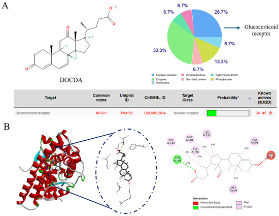 Identification of the GR as a potential target of DOCDA. (A) Chemical structure of DOCDA and results from SwissTargetPrediction analysis, identifying the glucocorticoid receptor (GR, also known as NR3C1) as the top predicted target. (B) Molecular docking results showing the binding interaction between DOCDA and GR (PDB ID: 4UDC), with a docking score of −7.7 kcal/mol. Key interacting residues are visualized in a 2D interaction diagram.