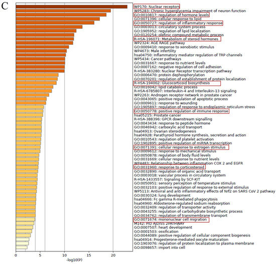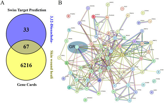 To explore the molecular mechanisms underlying the wound healing effects of DOCDA, we performed an integrated analysis combining target prediction and disease relevance. Potential targets of DOCDA were identified using SwissTargetPrediction, while genes associated with “skin wound healing” were retrieved from GeneCards. A total of 67 overlapping genes were identified and analyzed through protein–protein interaction (PPI) network analysis. The resulting network revealed functional clustering centered around the GR, suggesting its pivotal role in mediating the effects of DOCDA. Subsequent pathway enrichment analysis using Metascape indicated that these genes are significantly enriched in pathways related to nuclear receptor activity, the regulation of hormone levels, inflammatory responses, steroid hormone metabolism, glucocorticoid biosynthesis, immune activation, cellular responses to estrogen stimuli, corticosteroid response, and mononuclear cell migration. The key enrichment of terms such as “nuclear receptors” and “response to corticosteroids” reinforces the potential involvement of GR as a key regulator of anti-inflammatory pathways and keratinocyte function.