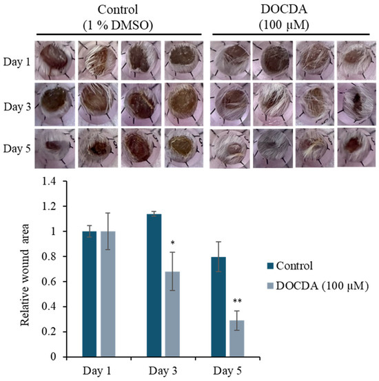 In vivo wound healing assay demonstrating enhanced wound closure with DOCDA treatment. Mice received topical DOCDA (100 μM) once daily, and wound areas were measured on days 1, 3, and 5 post-injury. Wound size is expressed relative to the area on day 1 (normalized to 1). DOCDA treatment significantly accelerated wound closure compared to the control group, with a marked reduction in wound area observed by day 5. Data are presented as mean ± SEM (n = 4); * p < 0.05, ** p < 0.01 vs. control.
