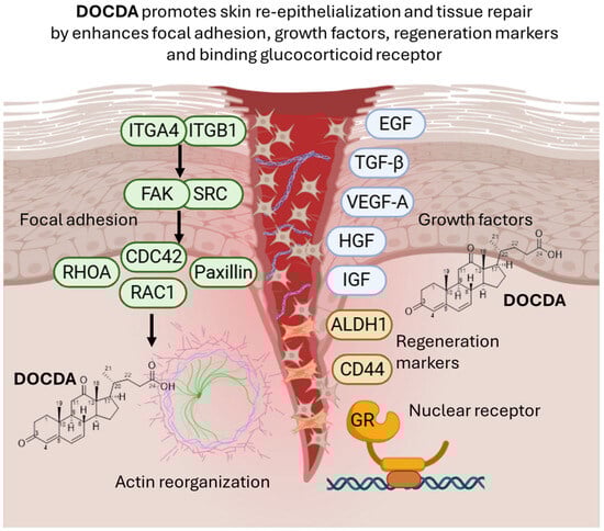 The diagram illustrates the role of DOCDA in promoting epithelial tissue regeneration. DOCDA modulate focal adhesion signaling by activating integrins (ITGA4 and ITGB1), focal adhesion kinase (FAK), and SRC, leading to downstream activation of RHOA, RAC1, and CDC42, which drive actin cytoskeleton reorganization. Paxillin also contributes to focal adhesion dynamics and actin remodeling. This cytoskeletal remodeling supports cell motility and tissue repair. Growth factors (EGF, TGF-β, VEGF-A, HGF, and IGF) are involved in enhancing the regenerative microenvironment. Regeneration markers ALDH1 and CD44 are upregulated in response to DOCDA, promoting stem-like cell behavior. Additionally, DOCDA binds the glucocorticoid receptor (GR), a nuclear receptor. Schematic representation created with BioRender.com (https://biorender.com, accessed on 29 June 2025).